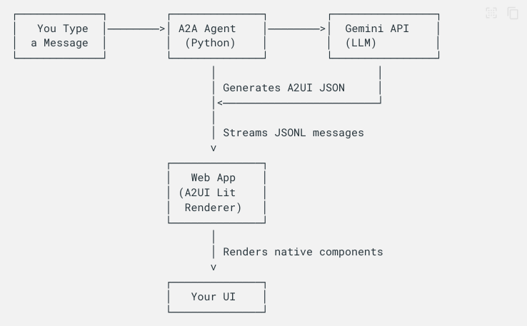 A2UI is a declarative protocol. The AI doesn’t generate code. Instead, it generates a recipe: a structured JSON description of what UI elements should appear, how they’re arranged, and what data they display.